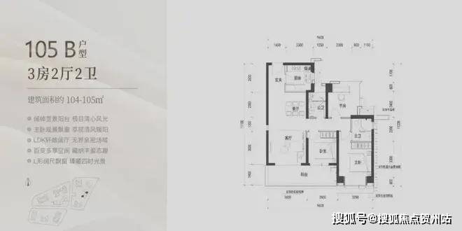 105㎡的3房2厅2卫,B户型(2栋3单元02/06户型),设计的是经典竖厅格局,客厅3.6米开间,LDKB一体化设计,三开间朝南,动静分区,3个卧室分别做到了主卧13.12㎡/次卧9.9㎡/次卧8.4㎡(包含墙体飘窗),客厅连接次卧出6.4米长的宽景大阳台,U型厨房,卫生间干湿分离,得房率约90%(包含赠送),正南或东南朝向。
