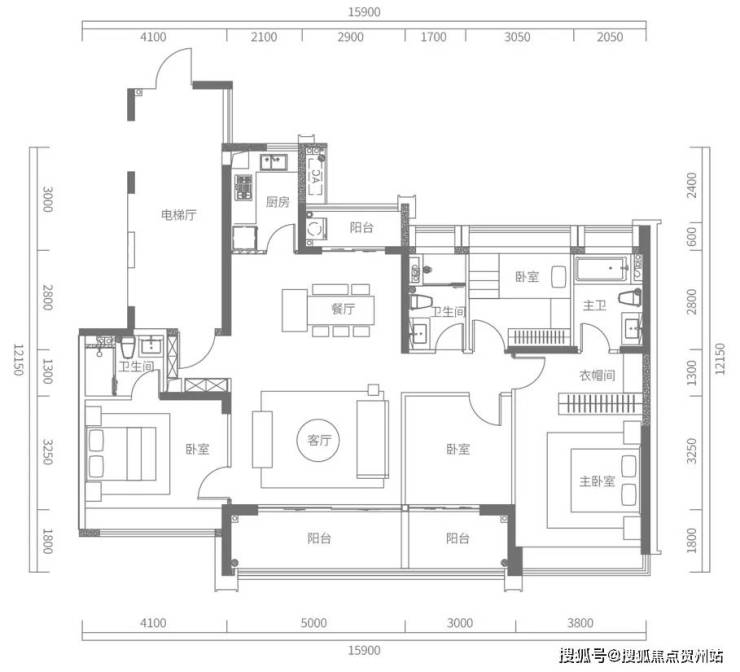 D户型建面约173㎡,4房2厅2卫