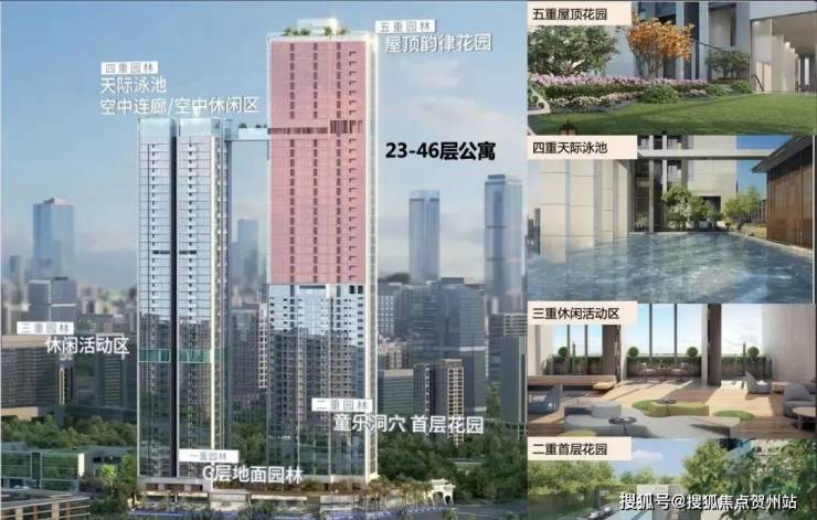 莱蒙水榭云上整体设计有五重立体花园,有地面园林、首层花园、休闲活动区、约133米高空“无边际泳池”,以及约166米高处的屋顶花园。这样的设计使建筑与生活更加结合,让业主从地面到空中不断跟“自然”相遇,每一层都能打开新的休闲空间。它冲向天际的地标级建筑,不仅为颜值而生,更是为生活方式而生。