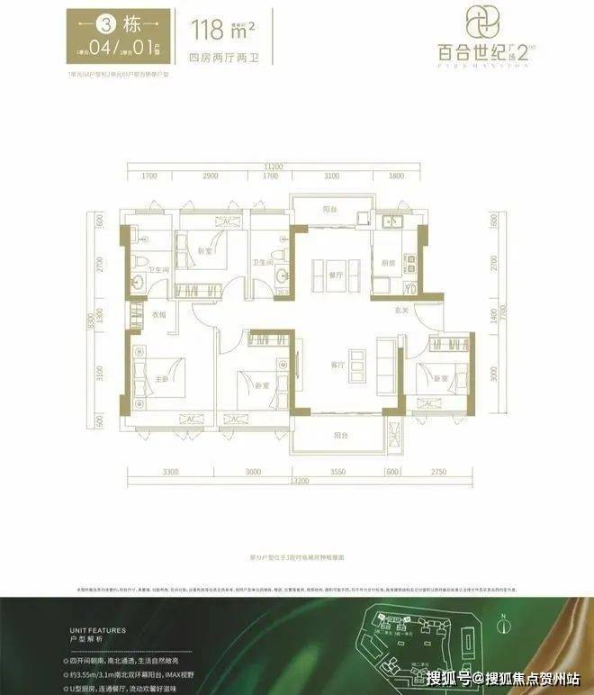 3栋1单元04/3栋2单元01户型,设计的是竖厅南北通透格局,进门入户玄关,客厅4.15米开间,客餐厅分离设计,南北双阳台,阳台主朝西南或东南向。