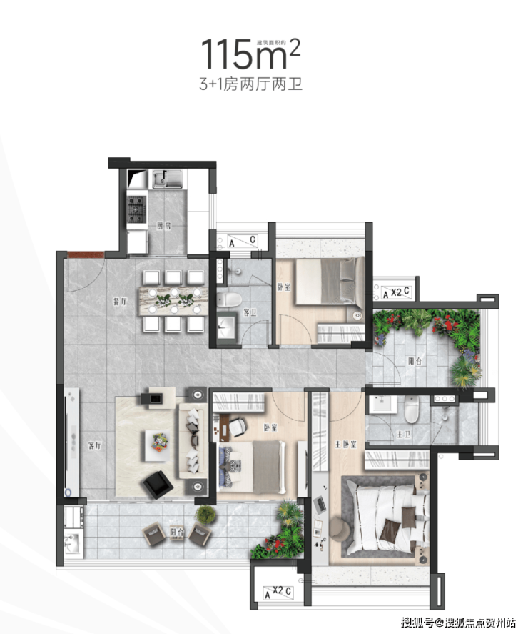建面约115㎡3+1房,采用LDKB一体化设计,空间宽敞明亮,更拥有超6米南向景观阳台,不仅增强整体的采光和通风,也多了一个休闲娱乐空间。东侧阳台,可按需布置成不同功能空间,适用于多孩或三代同堂家庭。