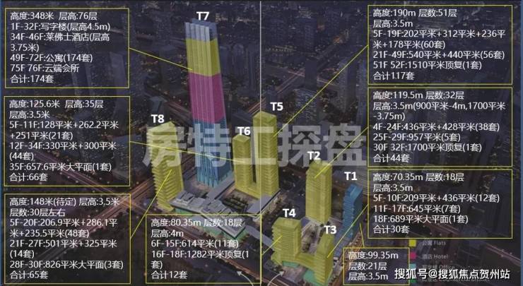 北区T1是写字楼,T2、T3、T4为公寓,南区T5、T6、T8为公寓,T7为环球商务中心;总建筑面积47.5万㎡。