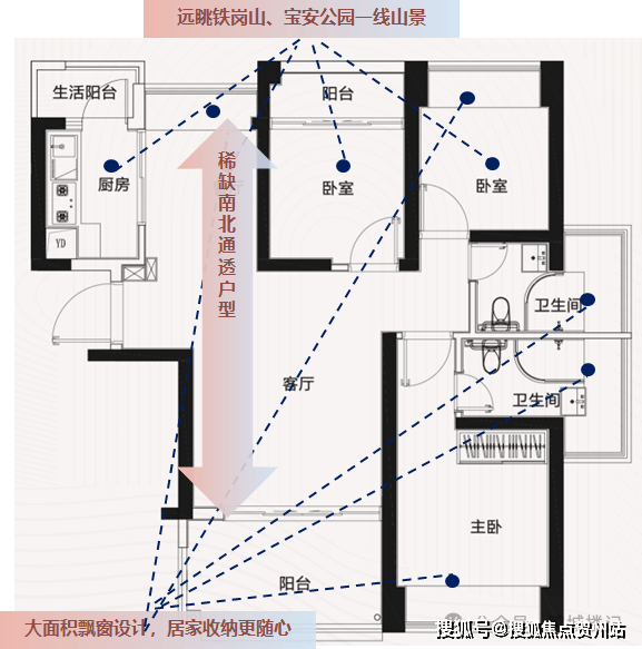 采用LDKB一体化设计,使厨房、餐厅、客厅、阳台联动,空间感更为开阔。主卧、儿童房、餐厅均配大尺度飘窗,采用双套房配置,满足三代同堂的居住需求。