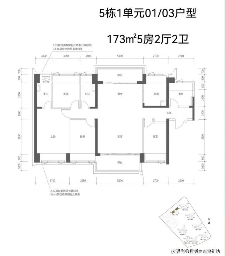 【五栋一单元-平面图】3梯3户,3条腿,分别是01、03号房户型约173㎡的5房2厅2卫、02号房户型约149㎡的5房2厅2卫