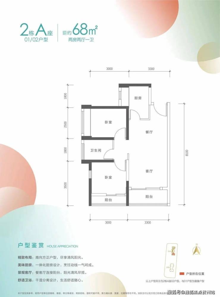 68㎡的2房2厅1卫,2栋A座01.02户型,设计的是竖厅格局,客厅3.3米开间,2个卧室分别做到了主卧10.5㎡/次卧9㎡(包含墙体飘窗),得房率约74.05%(不含赠送),朝正南向。