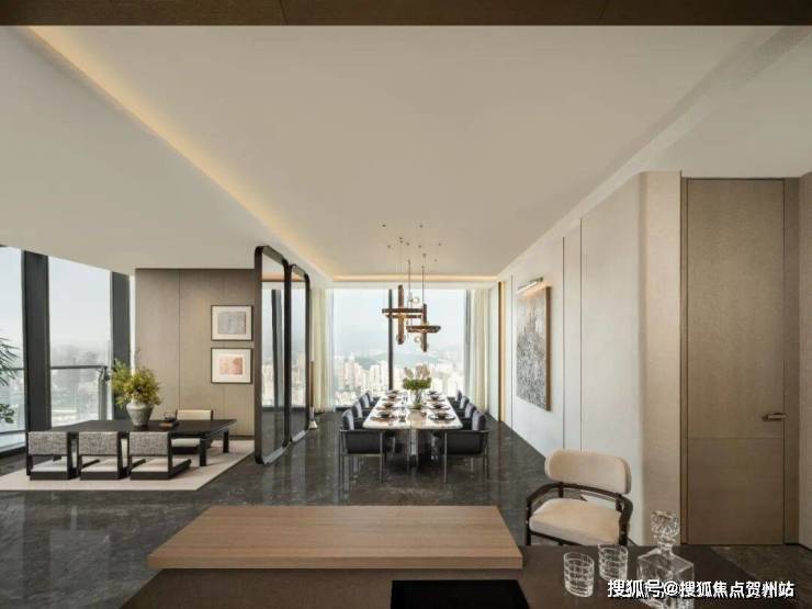 璟喜打造起承转合的入户礼制,从进入的一刻起,便将当代高净值人群含蓄、内敛、沉稳的品格呈现,45层云端大堂,23米巨幕落地窗,云顶之上,湾区盛景列阵迎宾。最多享8台全独立私密电梯入户,举步间高级审美趣味环绕,艺术氛围相随,随着行进过程不断变化场景;无界化的室内空间设计实现对城市地标群的全景收揽,在时代恒景中感受内心的宁静与放松。