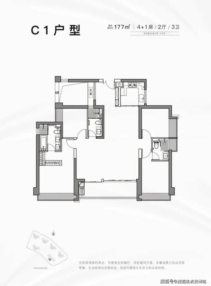 177平:5房2厅3卫,西南朝向,使用率77.43%(不包含赠送)