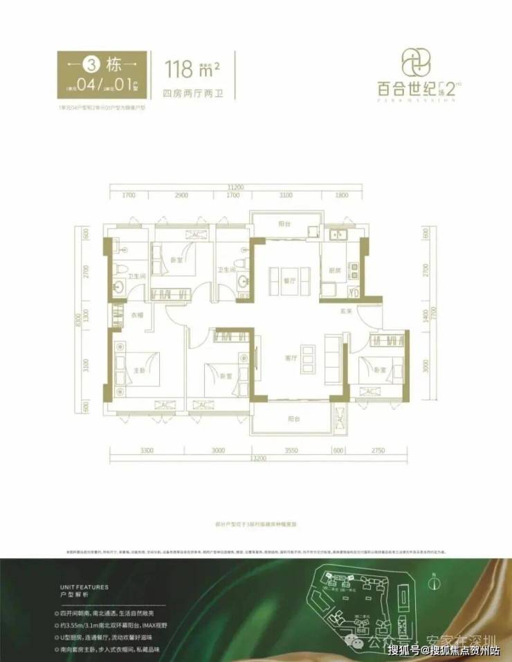 118㎡的4房2厅2卫,3栋1单元04/3栋2单元01户型,设计的是竖厅南北通透格局,进门入户玄关,客厅4.15米开间,客餐厅分离设计,南北双阳台,得房率约76%(不含赠送),阳台主朝西南或东南向。套内面积89.68㎡+赠送15.44㎡=105.12㎡,加上赠送得房率约89.08%。