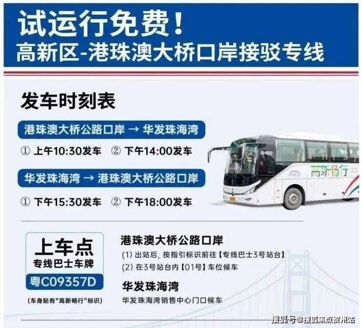 随着"港车北上"政策深化,特设高新区华发·珠海湾——港珠澳大桥口岸接驳专线,设置珠海湾站,试运行期间免费搭乘,让港澳同胞出行更加便捷。