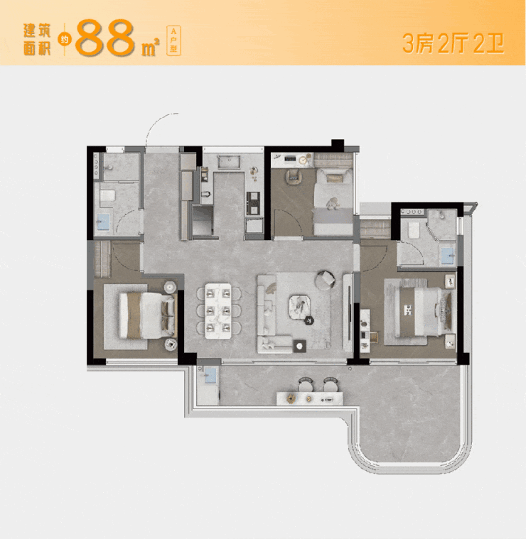 建面约88㎡的小户型,能做到三房两卫+主卧套间的配置,客厅开间5.6米的尺度,全赠送的超大空中露台,整体空间拉满。
