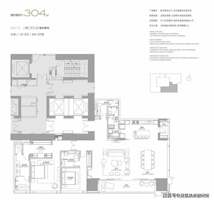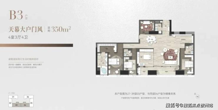 位于27-39层,每层2套对称分布,整个T2栋26套。比308㎡多一个房间和一个艺术品展示区,四个房间有三个都是套房设计,另外一个雪茄房,也能改造成书房、会客厅等。