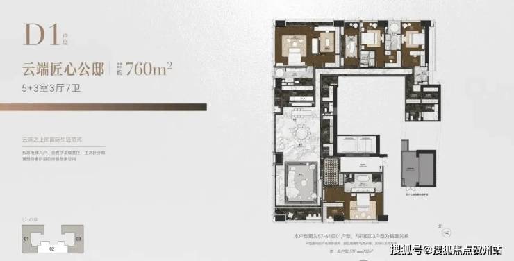 位于57-61层,每层两套对称分布,整个T2栋仅10套。