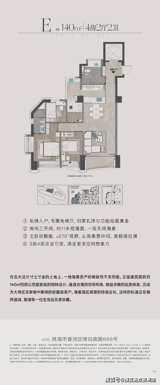 最新详情:项目位于珠海市香洲区情侣南路 666 号,由珠海九洲开发建设有限公司开发。当前主推 A 区 1 - 4 栋的 111 - 140㎡海景户型,处于热销阶段,预售许可证齐全,售楼处地址就在项目所在地,有意向可前往实地看房