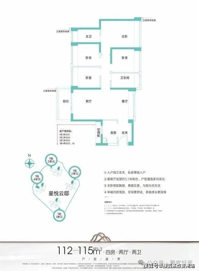 112-115㎡四房两厅两卫:竖厅通透格局,客厅3.7米开间,进门独立入户玄关,全屋飘窗设计。