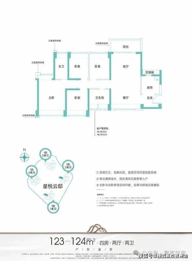 123-124㎡四房两厅两卫:竖厅南北通透格局,进门独立入户玄关,全屋飘窗设计,U型厨房。