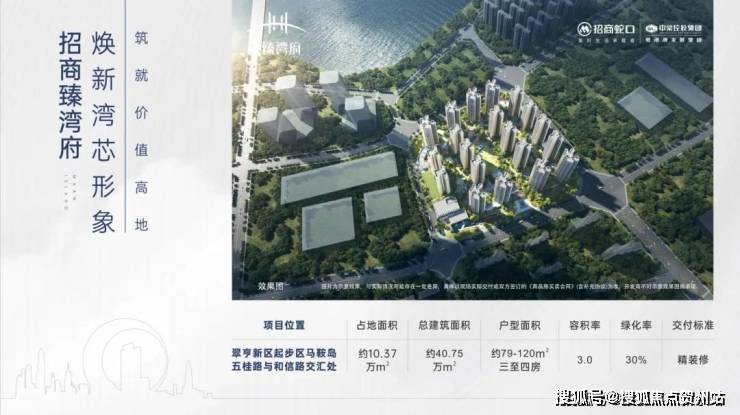 招商臻湾府作为招商蛇口在马鞍岛布局的第四大力作,地处翠亨新区马鞍岛和信路与五桂路交叉口南,距深中通道出口不足1公里-7,是深中同城生活的桥头堡。项目总占地面积约10.37万平方米,总建筑面积约40.75万平方米,容积率3.0,绿化率30%-4,规划20栋31至34层高层住宅,总户数约3100户,车位2479个,车位比约1:0.8-5。项目由招商局积余产业运营服务股份有限公司提供物业管理,物业费3元/㎡·月-3,已于2024年12月起分批交付-4,目前在售房源为精装准现房,预计2026年12月全面交房-2。