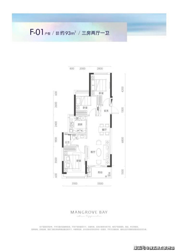 F01户型93平3房2厅1卫:客厅、餐厅连通阳台,自然采光充足;宽景竖厅,空间开阔;主卧独立卫生间,隐私雅奢生活;动静干湿分离。