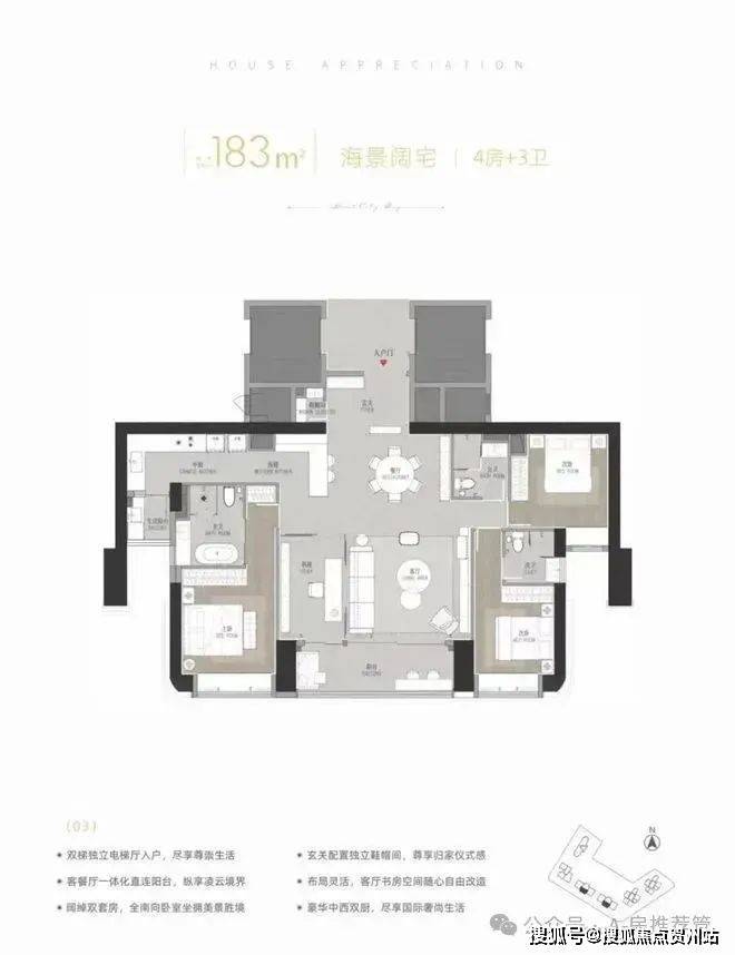 所有建面约250平以上的户型全都是南北通透的方正大户型,层高也都设置为约3.3-3.5米超大层高,绝对的豪宅打造,17层以上就可以看到比较明显的海景景观,2000-3000万以上的改善客户可以重点考虑。