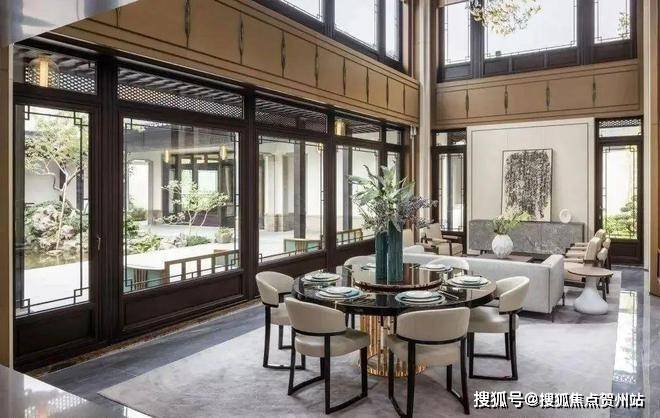 合院别墅:增加大量玻璃系统窗、挑檐面积、灰空间面积,防晒遮阳,空间少梁化,双层地下挑高会客厅,中式美观与人居实用并举。