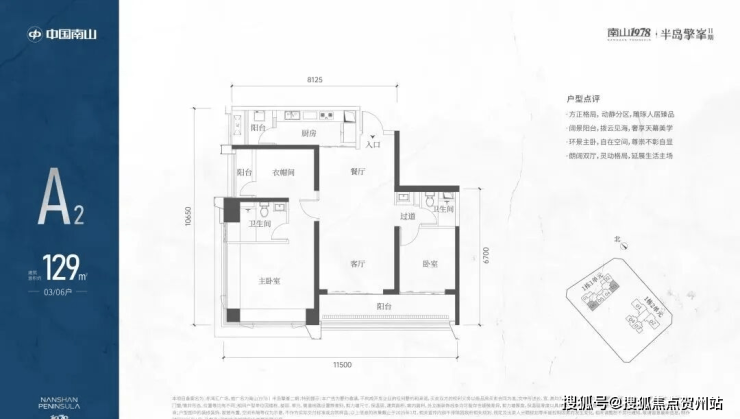 A2有两条腿,分别1-1栋03/06,主朝向是东南向,双龙抱珠格局。这个户型是超阔大阳台,朝向优于A1,但公卫是个暗卫。
