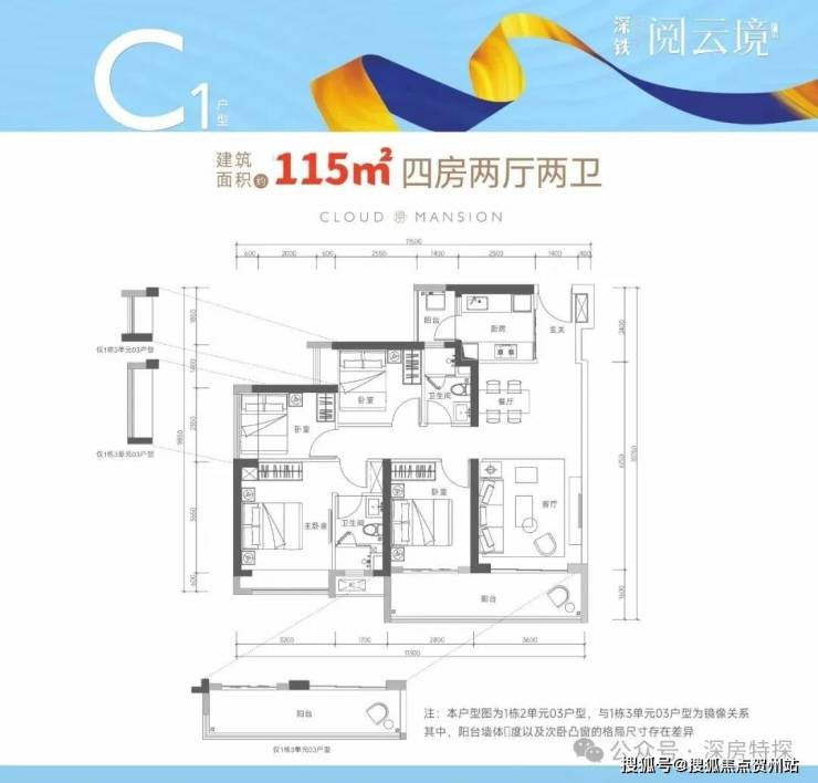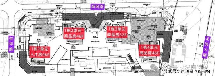 深铁阅云境广场,由深铁集团开发,总建筑面积约16万㎡,计容建筑面积约11.2万㎡,容积率6.1,绿化率40%,共由4栋总高32-46层的住宅组成,包含3栋商品房+1栋人才房,其中1栋1单元人才房46F,1栋2单元商品房46F,1栋3单元商品房32F,1栋4单元商品房45F。