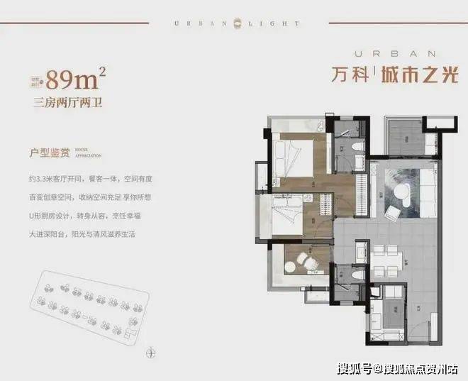 中山·万科地产城市之光項目項目的户型图设计上,秉持了万科地产城市之光系列产品创作的优势和特征,不但进深宽阔,向南透彻,南北方自然通风之外也确保了光照优异;每个功用间分间显著,多功能性更为实用性的同时还能提升房屋的整个外观。让每一个房型都真真正正对得起“城市之光”的称号。