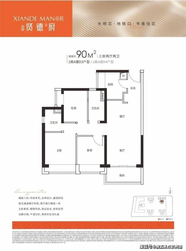 90㎡ 3房2厅2卫 传统竖厅设计 3开间朝南,客餐厅南北对流,主卧套房设计。