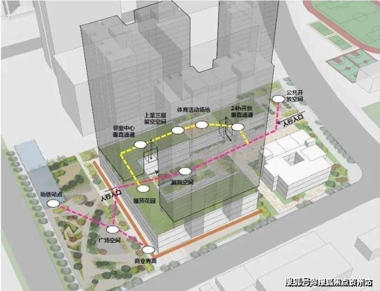 另外,通过打造绿色空间构建地面与空中多层次的立体活动空间,公共空间及垂直交通体系将24小时对市民开放,实现地面空间与裙房屋顶的连通,构建全天候开放式垂直慢行系统。示意图
