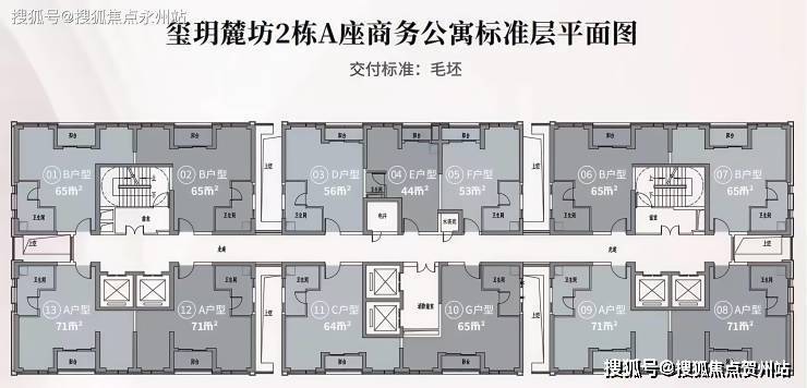 目前在售的商务公寓户型包括44㎡的1房、53-56㎡的1房以及63-65㎡和71㎡的2房2厅1卫。