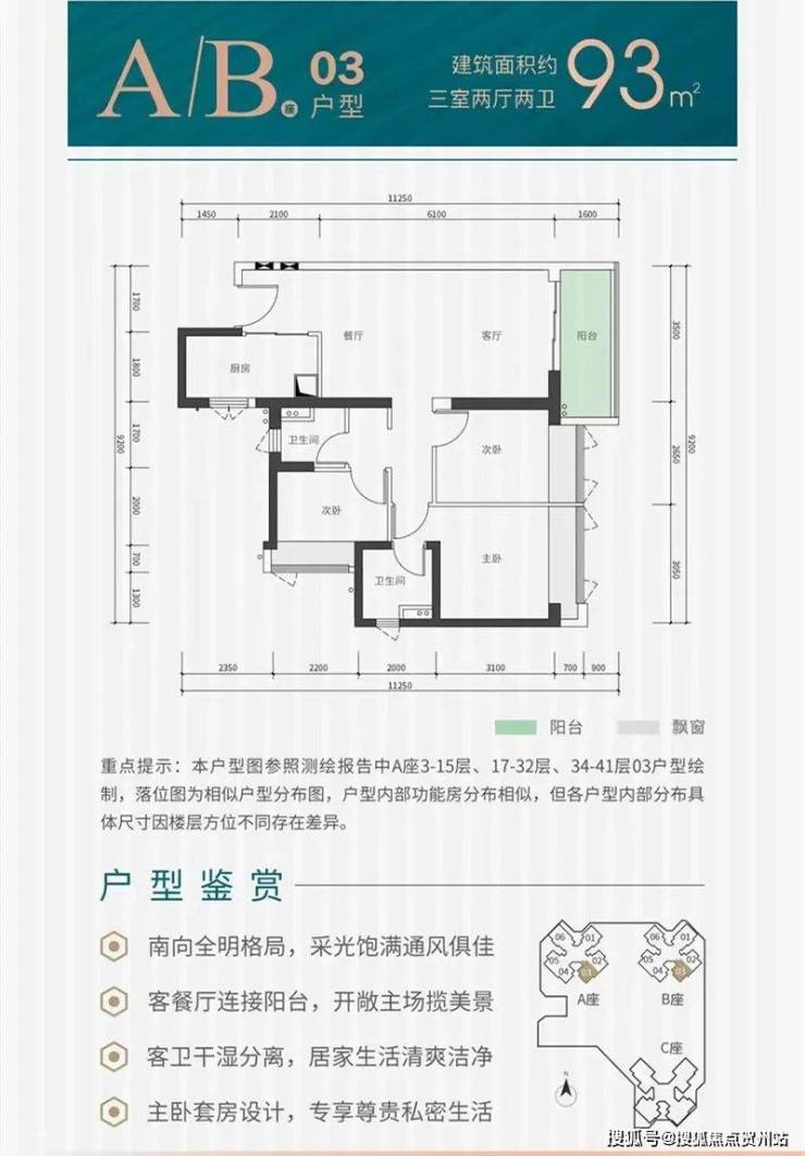93㎡三房两卫:折后总价264万起(单价2.83万/㎡起),全南向采光;
