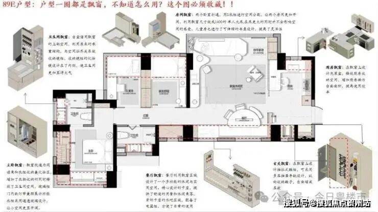 这里89E户型可以改为3+1房四房,但是虽然说是改四房但是是牺牲了餐厅改为房间,他把餐厅放到了飘窗位但是有点拥挤,或者可以学润宏城一期把餐厅放到厨房一体化,当然如果不改四房单纯做三房两卫,这个户型还是挺能打的,整体空间都挺大,而且还是双面采光。