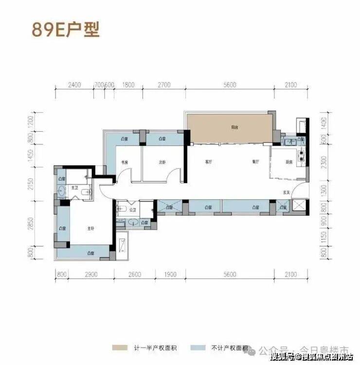 相比89E户型,飘窗设计相对较少,整体赠送空间与市场主流产品接近,实用率约95%。户型规划方正,动静分区合理,采用四开间朝南设计,采光和居住舒适度较好,算是中规中矩的产品。