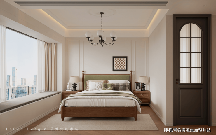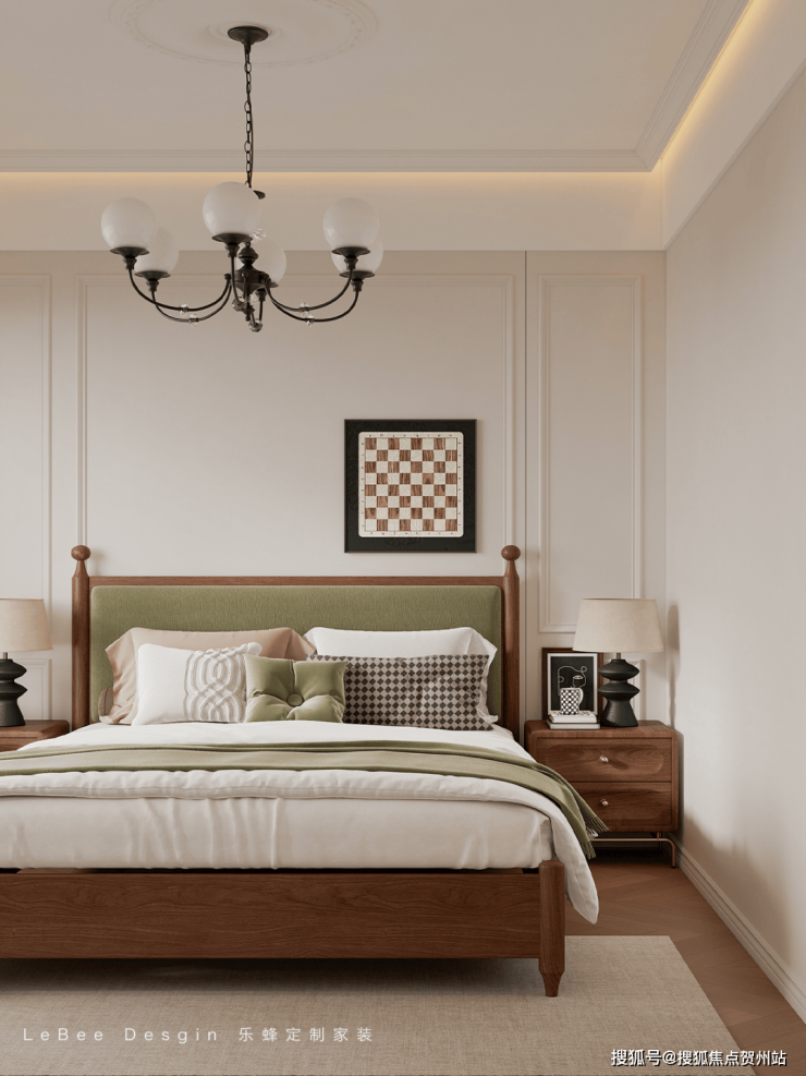 主卧室延续法式中古的优雅格调。精致的护墙板搭配柔和灯光,营造出温馨私密氛围。