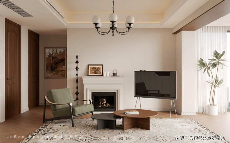 客厅摒弃传统电视背景墙,电视不上墙,移动电视更自由灵巧~电子壁炉简直是氛围感神器!跳动的光芒和温暖的色调让人感受家的温馨。