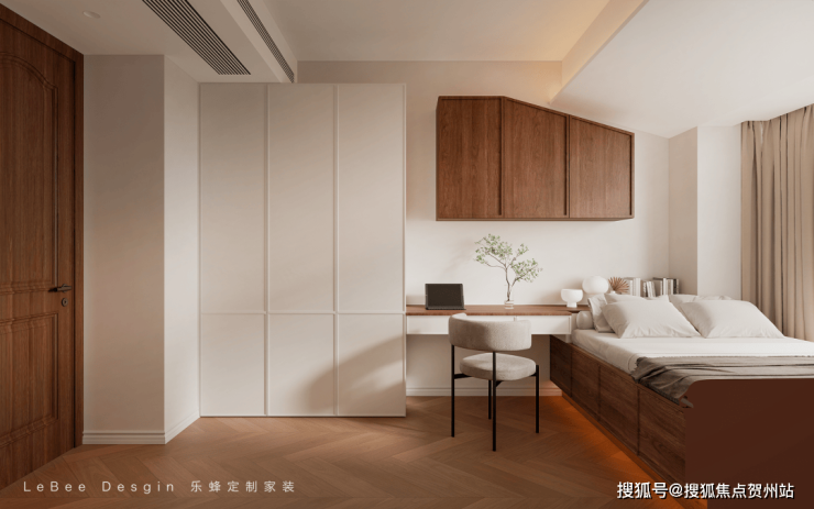 空间以柔和的浅色调为主,米色墙面搭配木色人字拼地板,营造出温暖、宁静的氛围。
