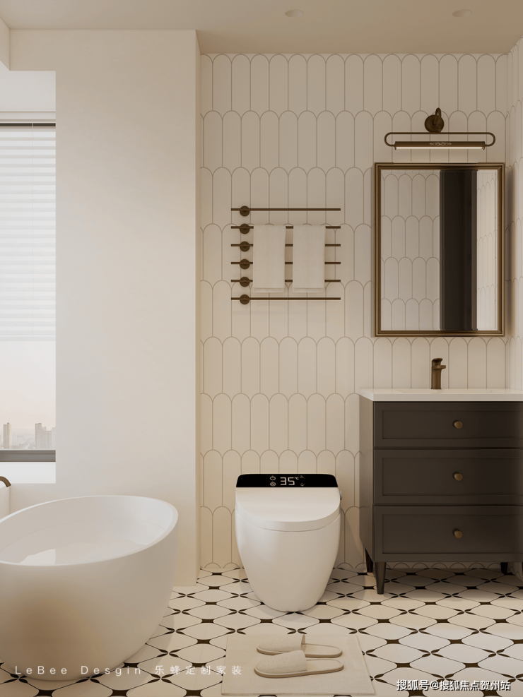 卫生间以灰色调上以米白、深棕为主,营造出温暖雅致的氛围 。营面上的米色瓷砖带有简约的拱形线条图案,精致又复古,丰富了视觉层次。