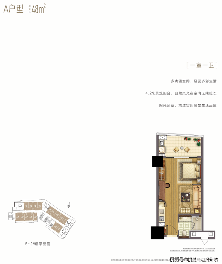 【建面约48㎡】功能齐全小户型,小空间实现大享受,赋以7.8米进深,4.2m大开间和看海大阳台。巧妙一体式布局,让室内每一处都能充分迎接阳光、大海与海风的沐浴。