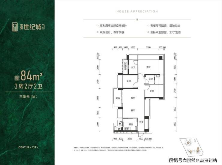 84㎡的3房2厅2卫,设计的是横厅南北通透格局,客餐厅5.1米开间,LDKB一体化设计,全屋10面飘窗,五开间朝南,主卧双面飘窗270°观景,3个卧室分别做到了主卧15.3㎡/次卧8.16㎡/次卧7.68㎡(包含墙体飘窗),U型厨房,卫生间干湿分离,阳台5.61㎡主朝西南向(差不多正西)。得房率约103.32㎡(包含赠送),赠送面积有22.8㎡。