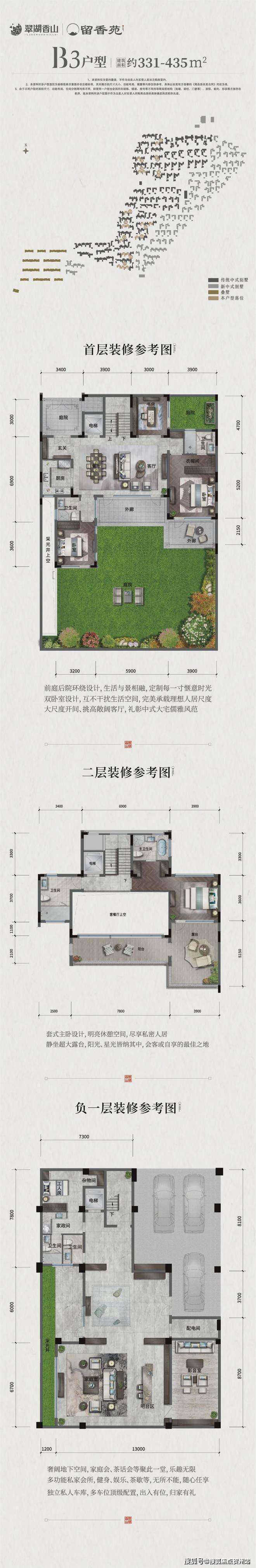 合院别墅(315-679㎡):融合玻璃系统窗、挑檐灰空间等设计,兼顾采光与私密性,地下室挑高会客厅尽显奢华