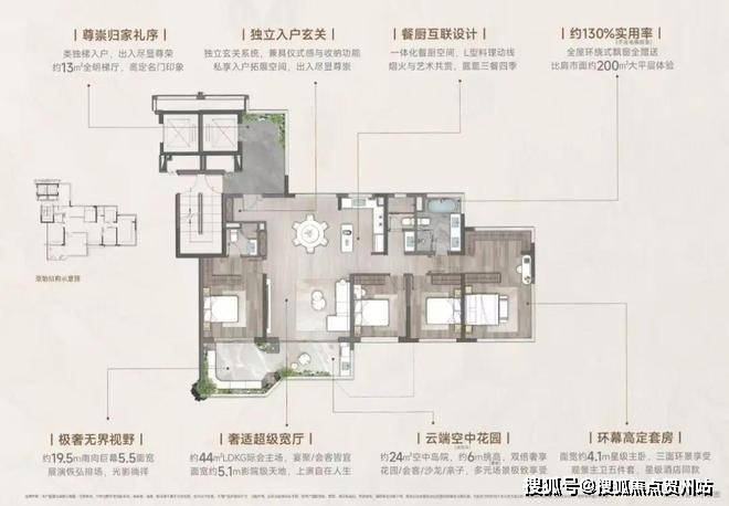 以约44㎡无界宽厅划写天际线,约19.5米环幕视界打破空间桎梏。奢适主卧套间三面环景,270°环幕飘窗私藏四时光影,以约139㎡空间容器承载约200㎡奢居想象。