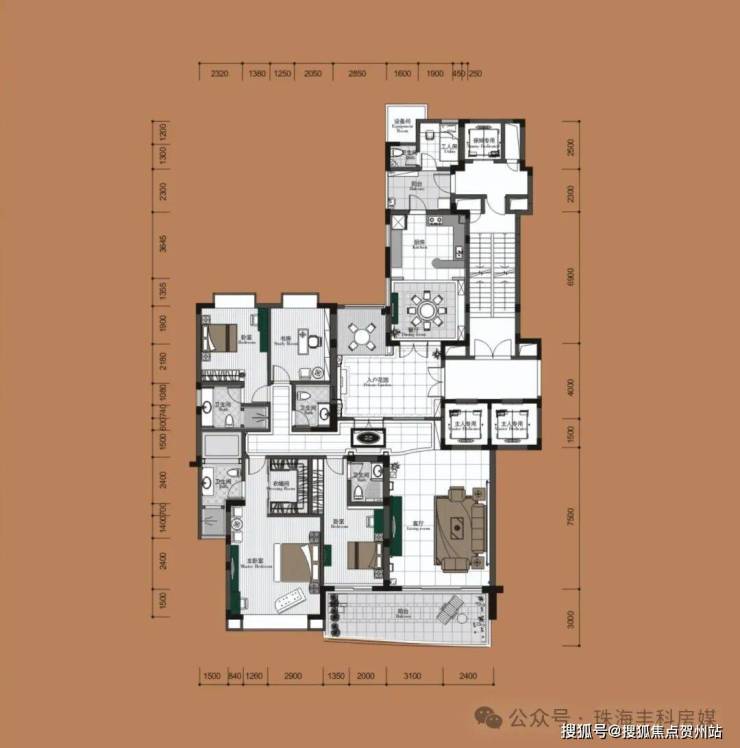C户型:建面约297.67㎡、四房两厅五卫+工人房+超大入户花园(豪装)