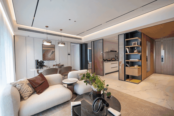 约6.5米的奢阔大横厅,非常适合与朋友聚会,窗外的安缦系园林更是为居住舒适度加分,生活在这里,仿佛置身于世外桃源。