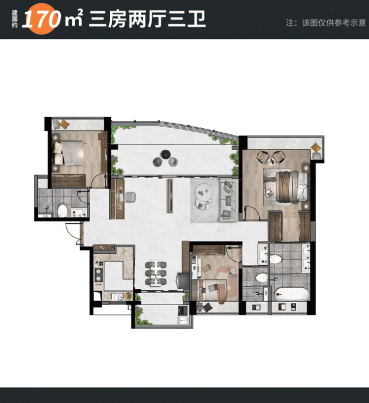 建面约133㎡的舒适四房,横厅竖厅随意切换;建面约155㎡的阔绰四房,全明格局,使整体空间更加开阔;建面约170㎡大三房,灵动三套房设计,更符合当下高品质居住需求。