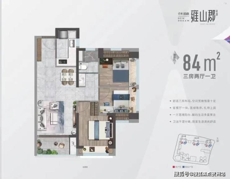 84㎡的3房2厅1卫,设计的是竖厅格局,客餐厅一体化,L型厨房,卫生间三段式分离,得房率:70.9%(不含赠送),阳台朝西南或东南向。