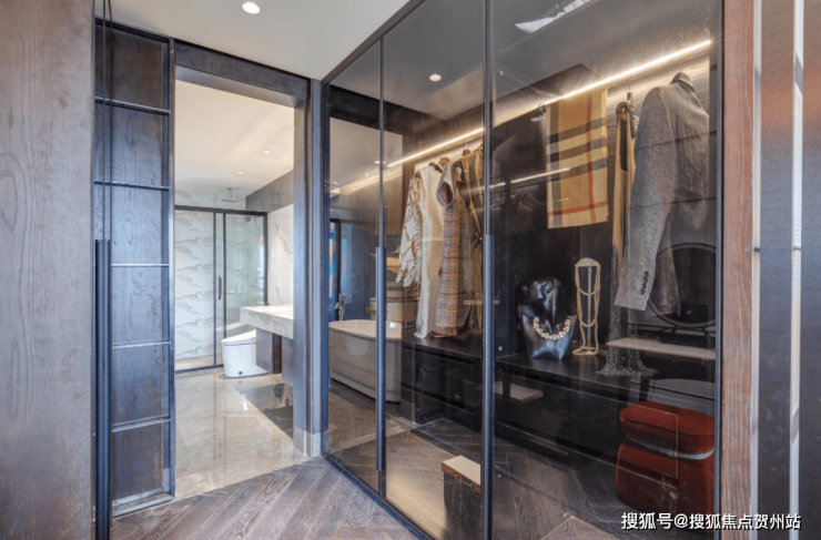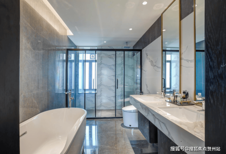 主卧带步入式衣帽间和豪华卫浴,两者开间达到2.5米,样板间用浴缸展示了其奢华尺度。