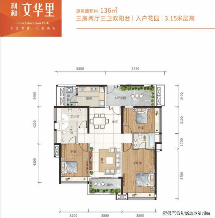 136m²三房三卫+入户花园