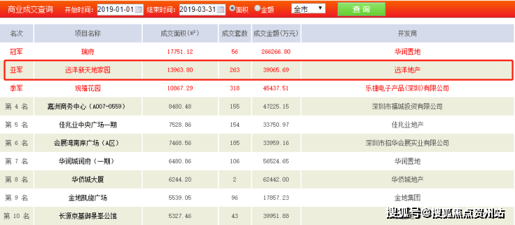 另一边,在深房网的数据上,2019年一季度远洋新天地以13963.8㎡的成交面积, 仅次于瑞府,在全深圳商业物业销量榜单上位居第二名。