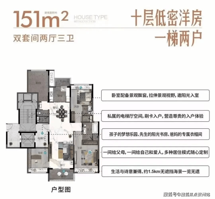 建面约151㎡四房两厅三卫片区仅此十层瞰海小洋房一梯两户,电梯刷卡入户,私享电梯厅,多一份私密也多一份空间高达99%使用率,让更多空间留给生活万科创新四叶草户型,三代同堂各得其所双阳台设计,南北对流,与清风阳光共处一室