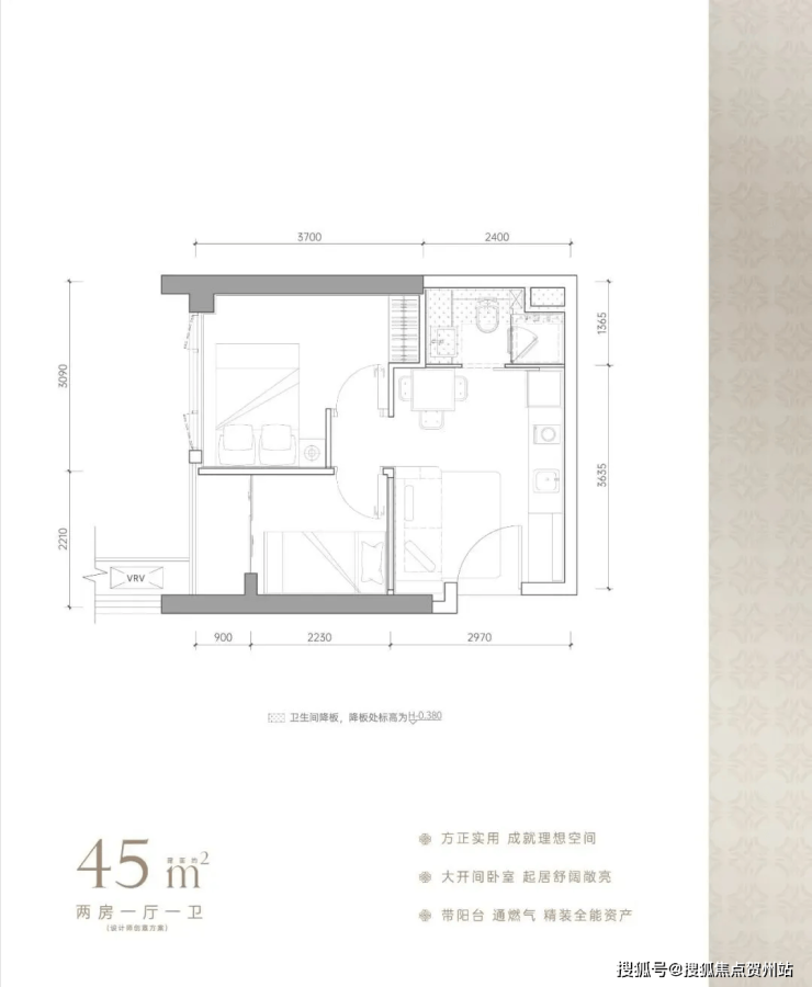 (1)45平米两房:折后总价170-190万左右;【折后单价3.8-4.2万】