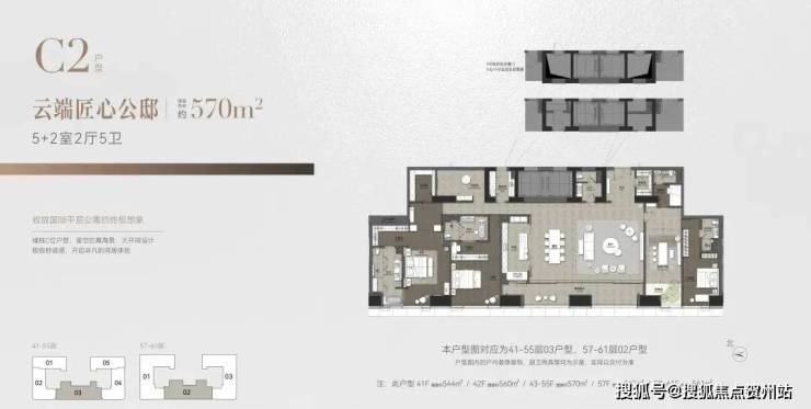 位于57-61层,每层两套对称分布,整个T2栋仅10套。